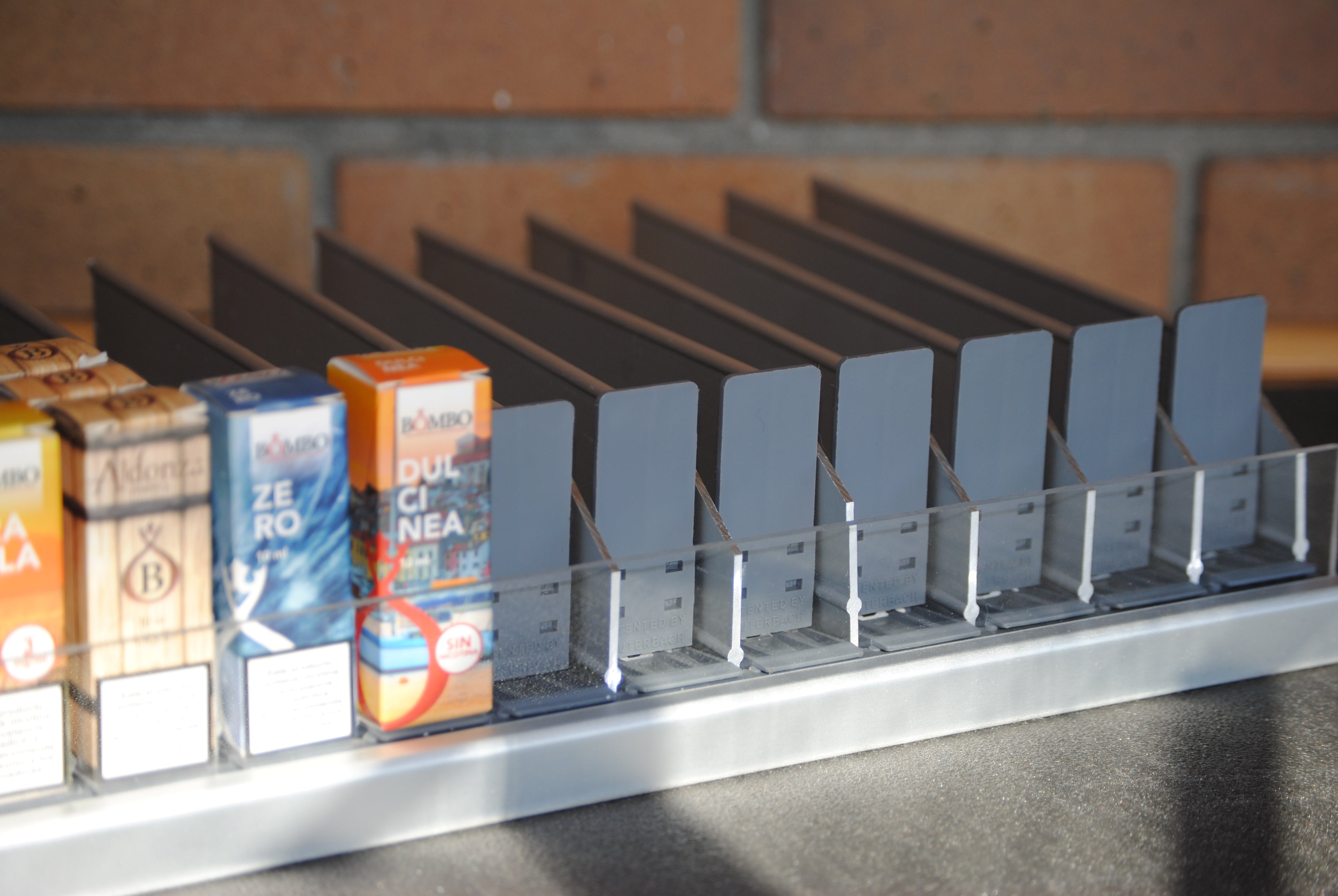 Nos tablettes à poussoirs sont idéales pour la présentation des paquets de cigarettes, tabac à rouler, cigares et produits de vape (liquides et devices).